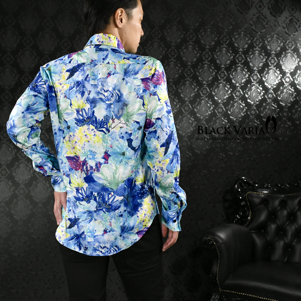 サテンシャツ ドレスシャツ 花柄 ボタニカル ドゥエボットーニ 日本製 スナップダウン 光沢 パーティー メンズ mens(ブルー青ホワイト白) 181112