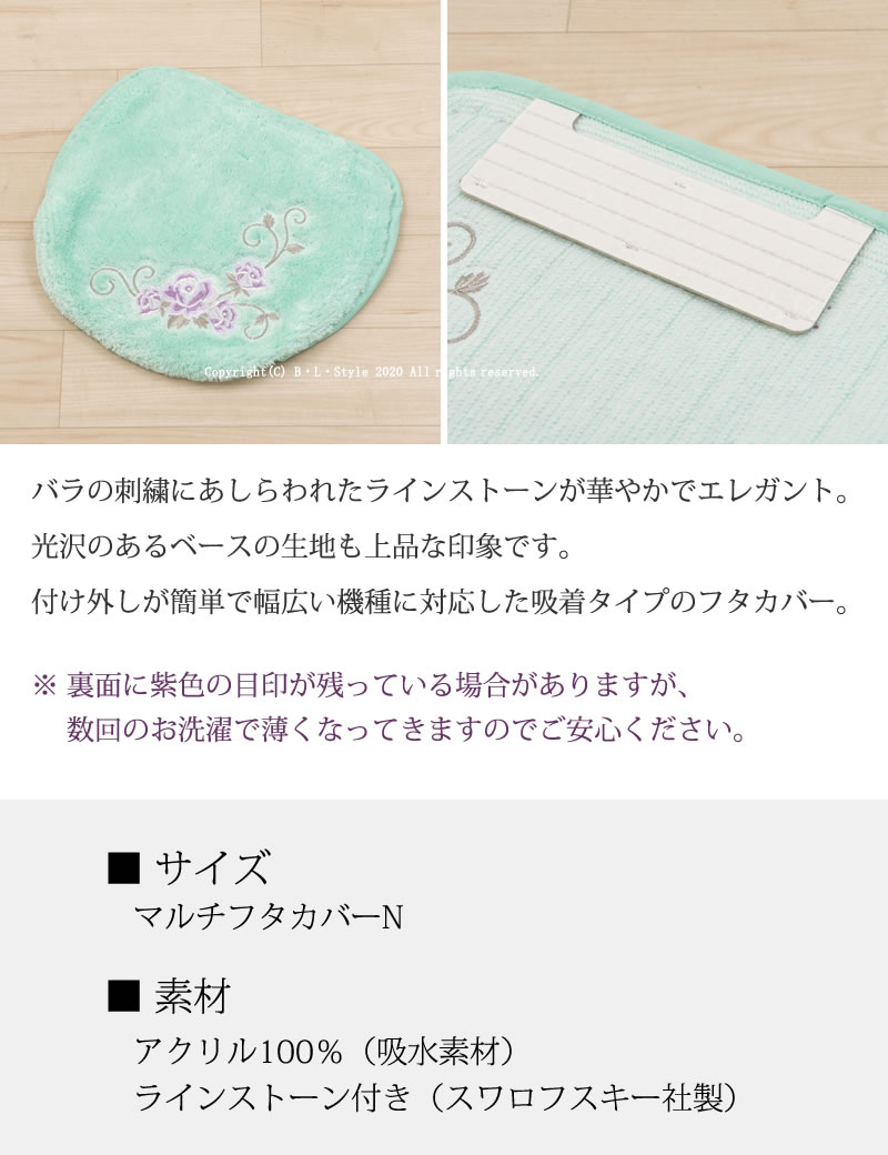 ▼ シリーズアイテムはこちら ▼ ▼ セット販売はこちら ▼ ▼ コーディネート用便座カバーはこちら ▼ Item Spec サイズ:マルチフタカバーN ⇒ サイズ詳細はこちら 素材:アクリル100%(吸水素材) ラインストーン付き(スワロフスキー社製) カラー:グリーン・アイボリー・ピンク 原産国:中国 Attention ! ・洗濯時に多少色落ちしたり、毛羽落ちすることがありますので、他の衣類といっしょに洗濯しないでください。