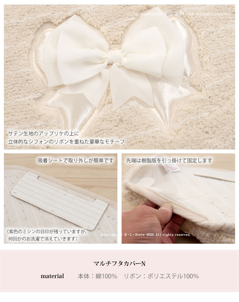 ▼ エレリュバンシリーズはこちら (クリックして全アイテムをチェック!) \ Info / シリーズアイテムはこちら ▼ セット販売はこちら ▼ ▼ コーディネート用便座カバーはこちら ▼ Item Spec サイズ:マルチフタカバーN ⇒ サイズ詳細はこちら 素材:(本体)綿100%、(リボン)ポリエステル100% カラー:ベージュ・ピンク・ホワイト 原産国:中国 Attention ! ・洗濯時に多少色落ちしたり、毛羽落ちすることがありますので、他の衣類といっしょに洗濯しないでください。